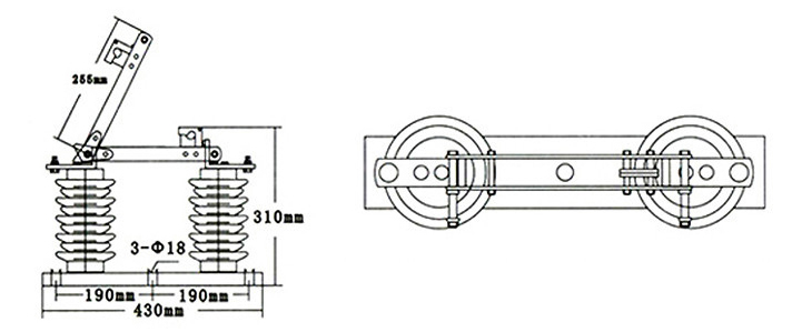 開關的額定電流有200、400、630、 800、1000安, 它們皆由底座、支柱絕緣子、導電部分和機構部分組成。采用閘刀式結構分合閘達到切斷和閉合線路。每相閘刀由兩片導電刀片組成,刀片兩側裝有壓縮彈簧,調節彈簧的高度可以得到開關閘刀所需要的接觸壓力。開關分合閘時用鉤棒操作機構部分便可以進行合閘運動。閘刀有自鎖裝置。開關的外型見圖所示。