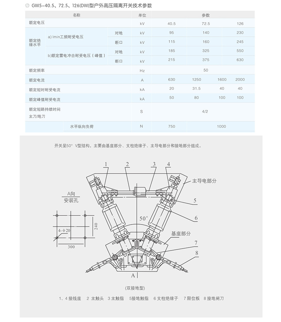 (2)隔離開關屬雙柱V形水平開啟式,各單級都由基座、支柱絕緣子、出線座及觸頭等部分組成,由50°夾角的兩個支座、兩支柱絕緣子相互夾角地安裝在基座兩端地軸承上,且與基座垂直。主導電部分分別安裝在兩支柱絕緣瓷瓶上方,隨支柱絕緣瓷瓶作約90°轉動。